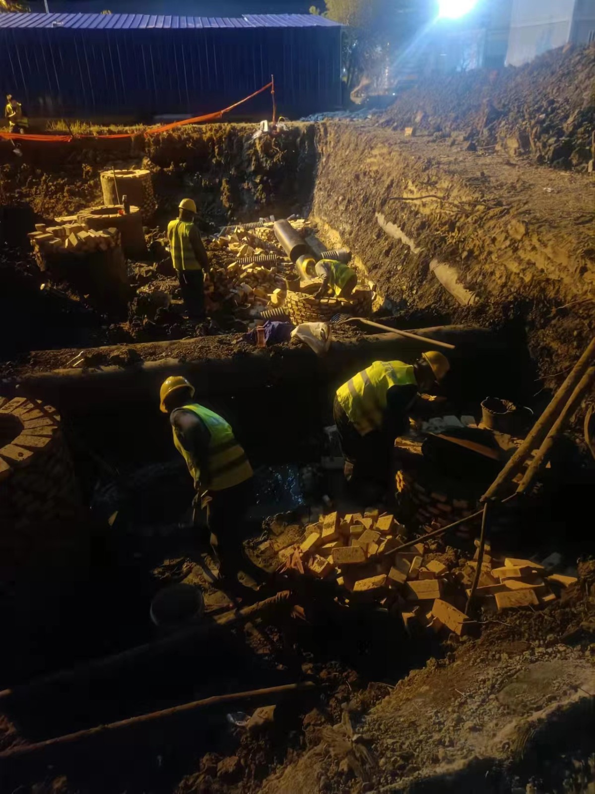按照分工,我部主要負(fù)責(zé)隔離點排污管道鋪設(shè)、部分場地平整、化糞池安裝、壓力泵站安裝等建設(shè)任務(wù)。生命重于泰山,疫情就是命令。我部在最短的時間內(nèi)完成了現(xiàn)場勘察,明確了施工方案,組織好人員、材料和機(jī)械,迅速展開施工。由于各援建單位都在搶抓時間,材料堆滿了施工現(xiàn)場。面對有限的工作面,我部積極協(xié)調(diào),見縫插針,同時克服現(xiàn)場無水的生活困難,吃住在現(xiàn)場,日夜趕工,接力連軸,快速推進(jìn)施工進(jìn)度。