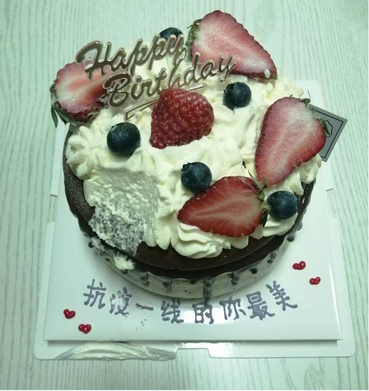 晚上,更大的驚喜來(lái)了,施德福組長(zhǎng)又讓人送來(lái)了生日蛋糕。圍著蛋糕,大家一起許愿:疫情散去,病毒消亡;山河無(wú)恙,國(guó)泰民安!